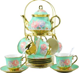 20 Pieces Porcelain Tea Set With Metal Holder, European Ceramic tea set for adults,Flower Tea Set,Tea Set For Women With Flower Painting (Large version, Green)
