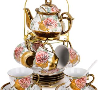 20 Pieces Porcelain Tea Set With Metal Holder, European Ceramic tea set for adults,Flower Tea Set,Tea Set For Women With Flower Painting (Large version, Green)