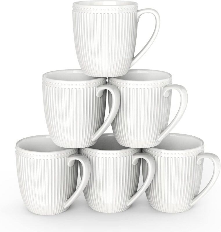 Coffee Mugs Set of 6, 16 Oz White Coffee Mugs, Porcelain Mugs, Large and Easy to Grip Mug Sets, Embossed Coffee Cup Set for Coffee, White
