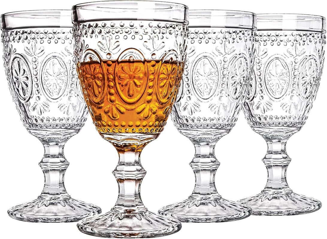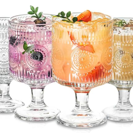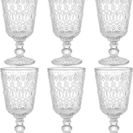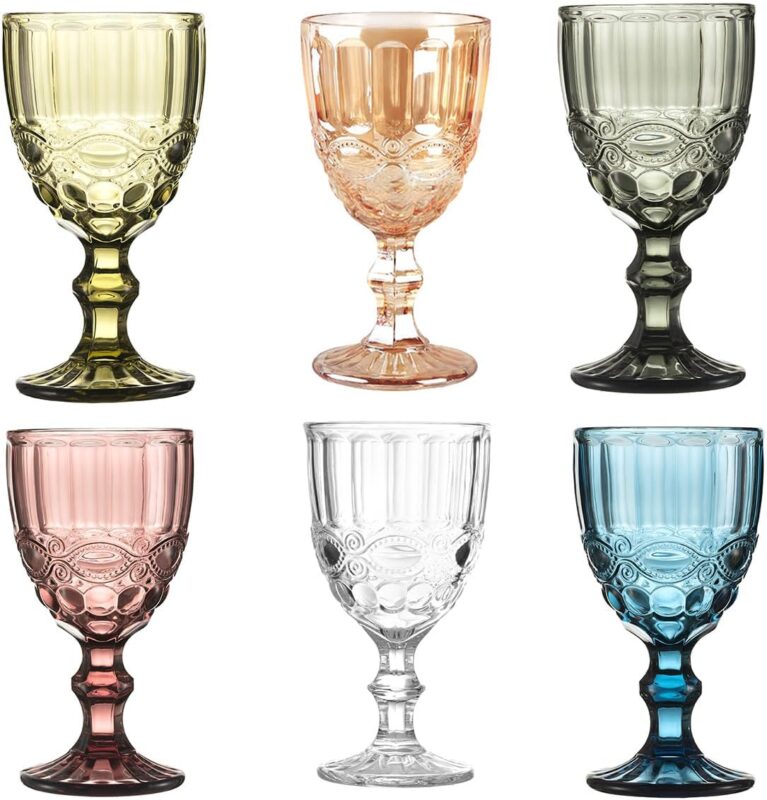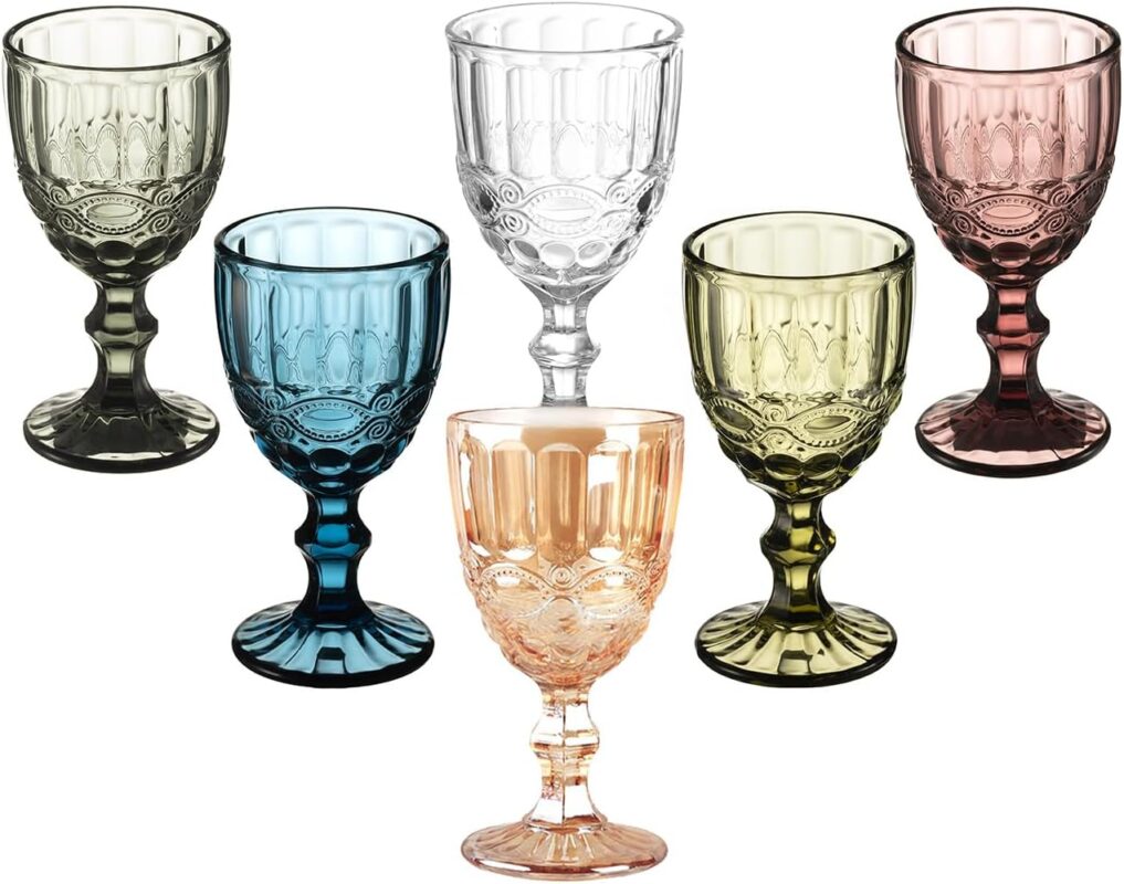 Vintage Wine Glasses Set of 6, 10 Ounces Colored Glass Water Goblets, Unique Embossed Pattern High Clear Stemmed Glassware Wedding Party Bar Drinking Cups Floral Mixed Colors