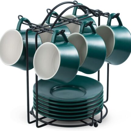 Tea Coffee Cup Set Afternoon Tea Drinkware Coffee Set European Style Glazed Porcelain Coffee and Tea Service with 6 Piece Cups and 6 Piece Saucer (Blue Set of 7)